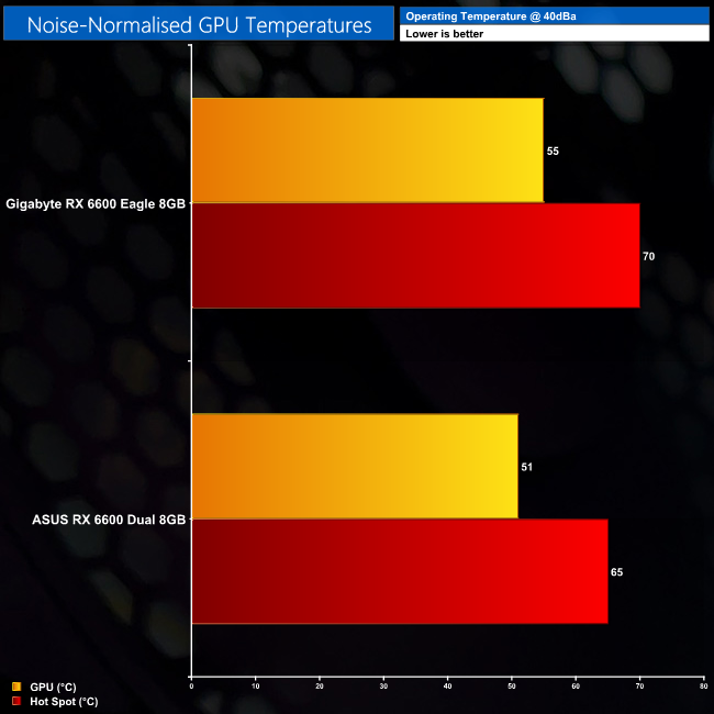 Both GPUs were already running very cool anyway, and we didn't see massive reductions in temperature when noise-normalising to 40dBa. If anything, you'd want to be slowing the fan curve for lower noise levels, as there is clearly plenty of thermal headroom to do so.
