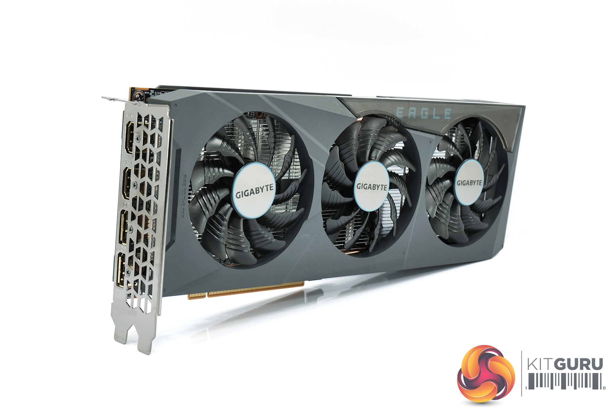 Looking at the graphics card itself, it will be a familiar design to many as we have already reviewed a handful of Gigabyte Eagle models this generation. It's a dark grey colour, using a plastic shroud, but with a translucent section towards the end of the shroud through which the Eagle logo can be seen.