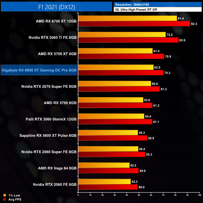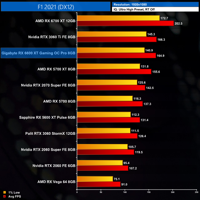 F1 2021, on the other hand, delivers the single most impressive set of benchmark results for the RX 6600 XT. At 1080p it is absolutely miles ahead of the RTX 3060 here, delivering 31% better performance, while it's also bang on level with the RTX 3060 Ti, which isn't something we have seen too much in our testing so far.