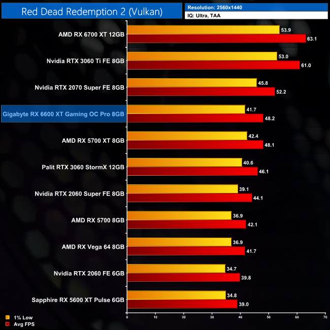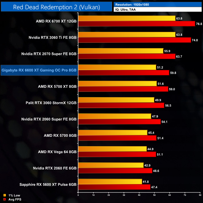 Moving onto Red Dead Redemption 2, at 1080p the RX 6600 XT is averaging just shy of 60FPS, which is not bad all when using Ultra settings in this game. It's once more dead level with the RX 5700 XT, while we're only looking at a 6% lead over the RTX 3060, which isn't that great considering the 15% difference in MSRPs.