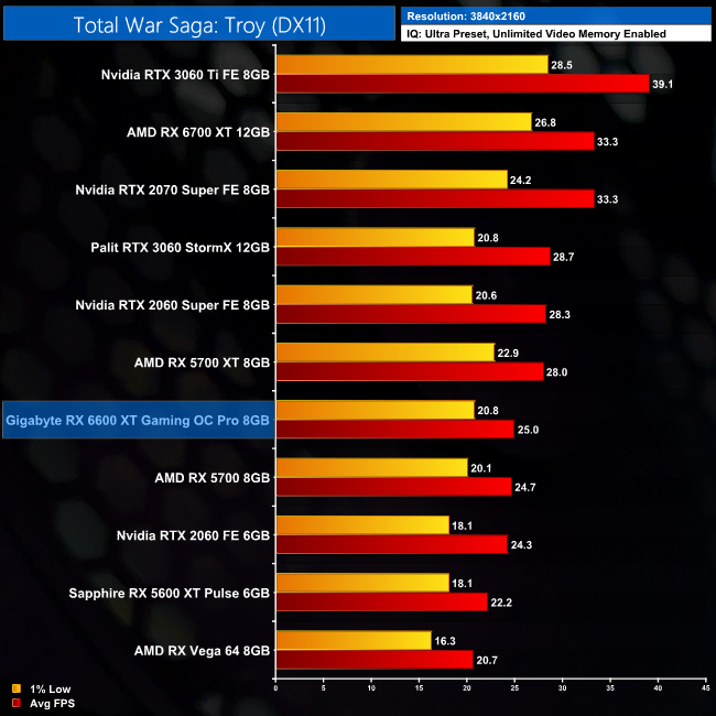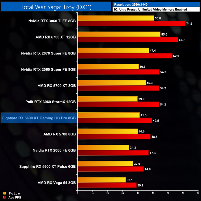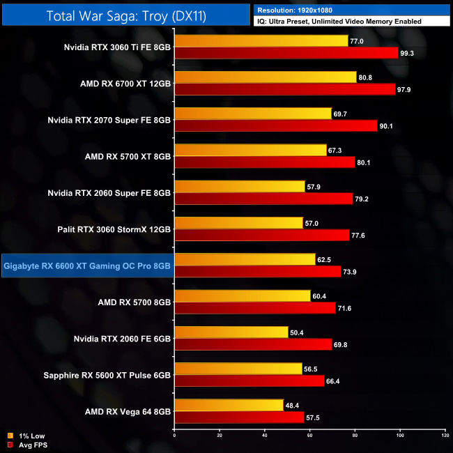 As for Total War Saga: Troy, this is the only other game, aside from Control, where the RX 6600 XT proved slower than the RTX 3060. There's not much in it, and actually the 6600 XT delivered better 1% low performance, so we're counting this one as a draw. The 6600 XT is, however, 8% slower than the RX 5700 XT at 1080p, when we'd really expect it to be faster.