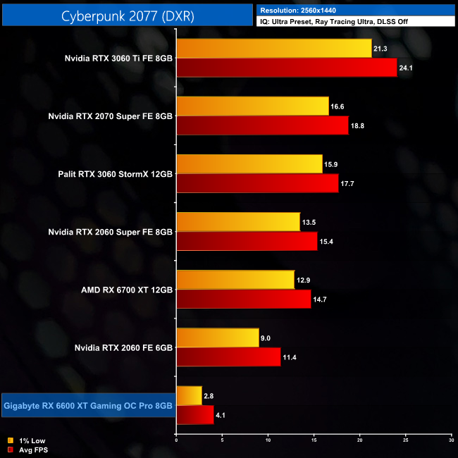 Kicking off our look at ray tracing performance, we know AMD GPUs struggle with the array of ray traced lighting effects found in Cyberpunk, so it's not a surprise to see the RX 6600 XT sitting bottom of the chart at every resolution. Even at 1080p, the two-year old RTX 2060 is outpacing AMD's new GPU.