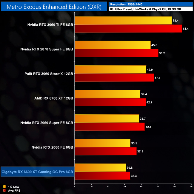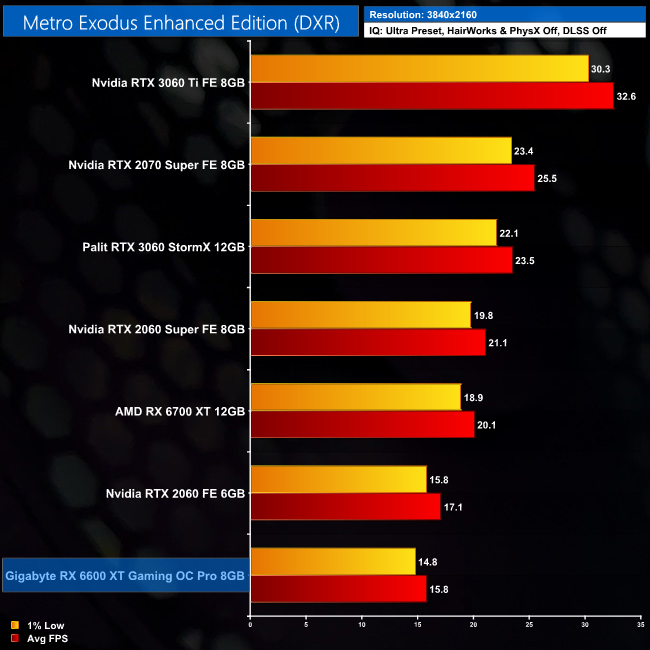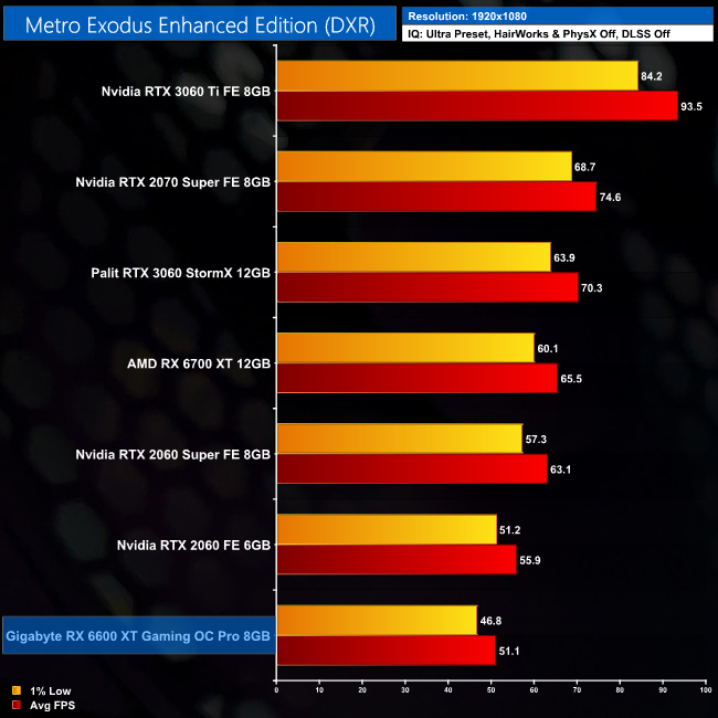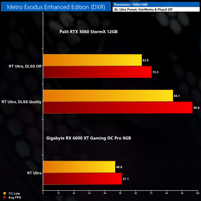 … so when we add it in for the RTX 3060, it is nearly twice as fast as the RX 6600 XT in Metro Exodus Enhanced Edition. Even without DLSS, the 3060 is 37% faster – and remember, this is meant to be the cheaper GPU.