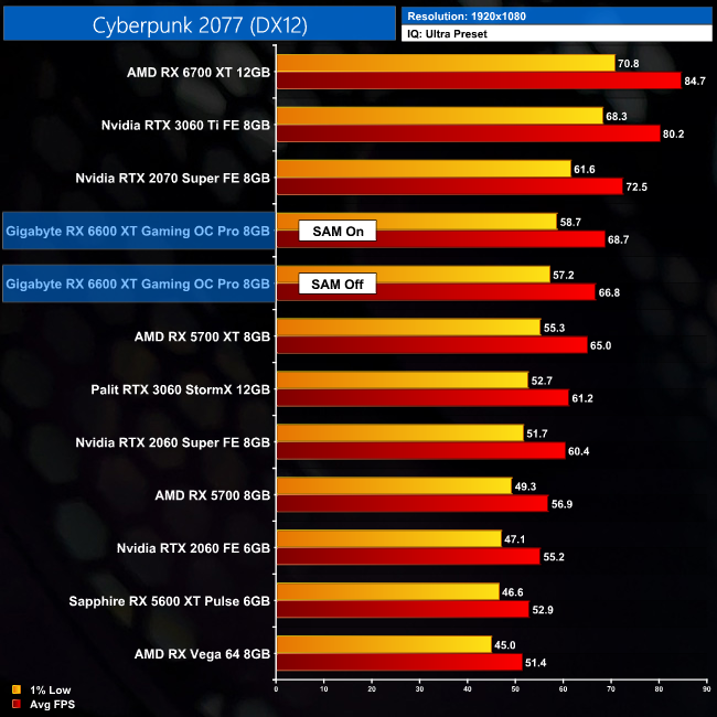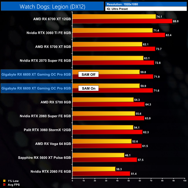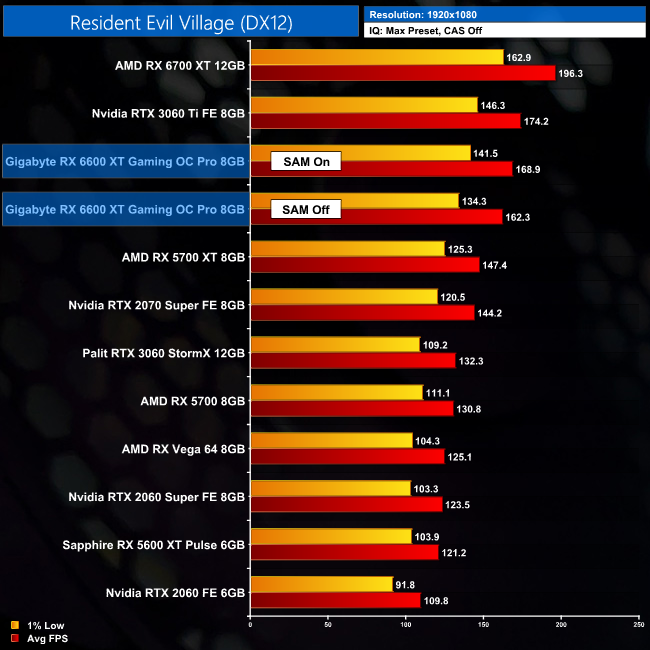 There's no real surprises here, with the RX 6600 XT up to 8% faster with Resizable BAR enabled when looking at Assassin's Creed Valhalla, though the gains are smaller in Cyberpunk and Resident Evil Village. Watch Dogs: Legion even shows a tiny regression, though the difference of just 0.3FPS is clearly within our margin for error.