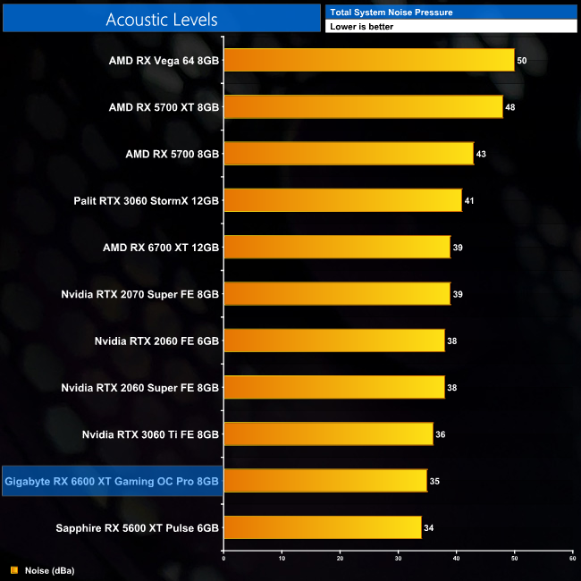 We take our noise measurements with the sound meter positioned 1 foot from the graphics card. I measured the noise floor to be 32 dBA, thus anything above this level can be attributed to the graphics cards. The power supply is passive for the entire power output range we tested all graphics cards in, while all CPU and system fans were disabled. A reading under load comes from running Cyberpunk 2077 for 30 minutes.