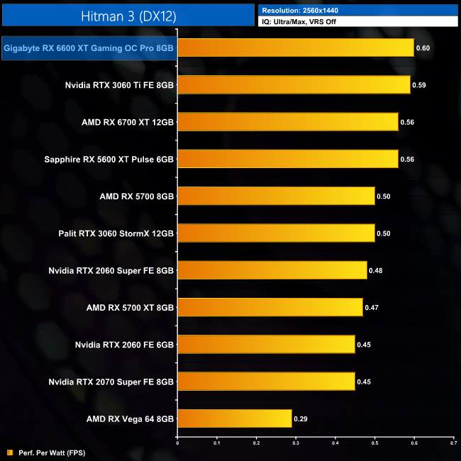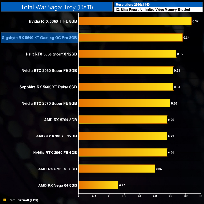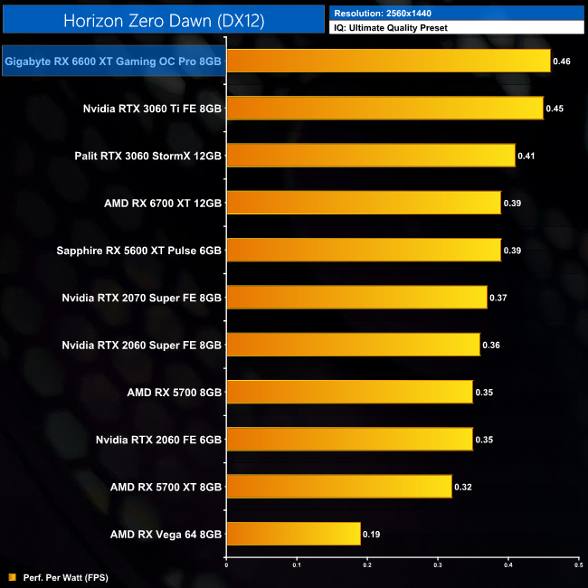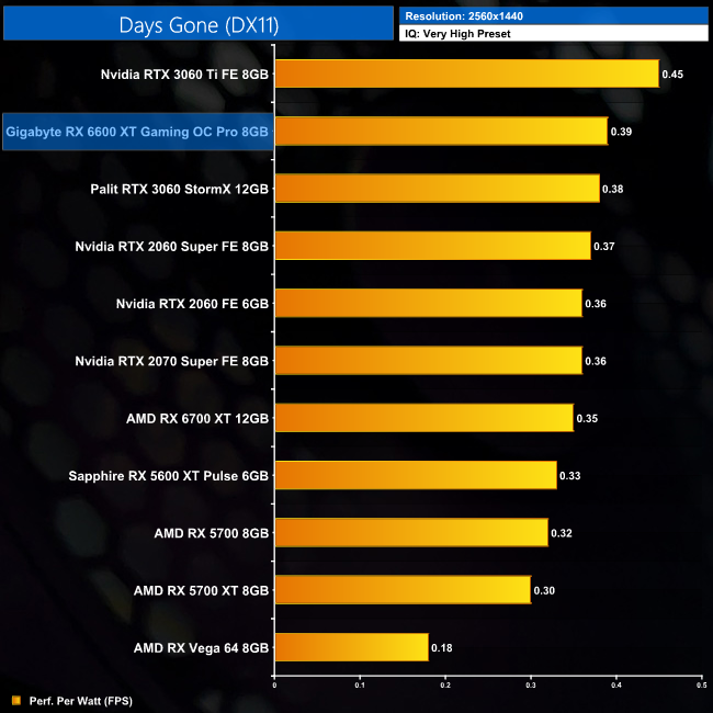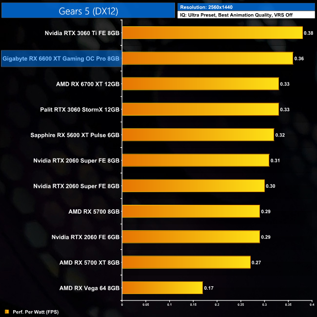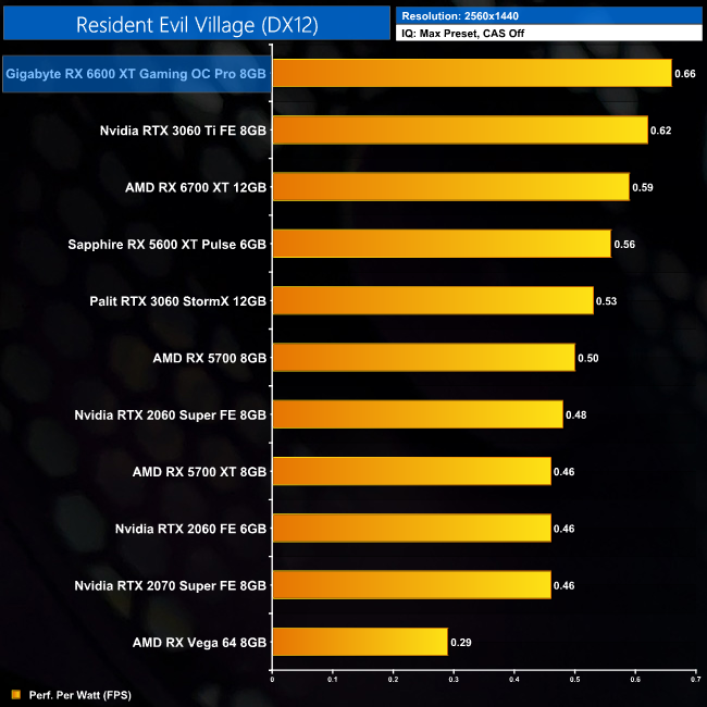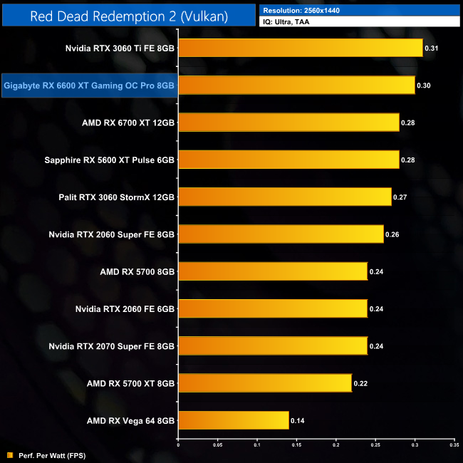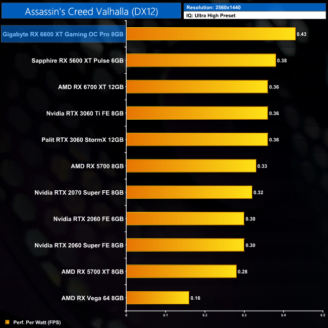 Even at 1440p, where the RX 6600 XT isn't as strong as it is at 1080p, the efficiency data is highly impressive – it's level with the RTX 3060 Ti, but still delivers 34% better performance per Watt than the RX 5700 XT, and we're not even going to mention Vega 64 at the bottom of the chart there…