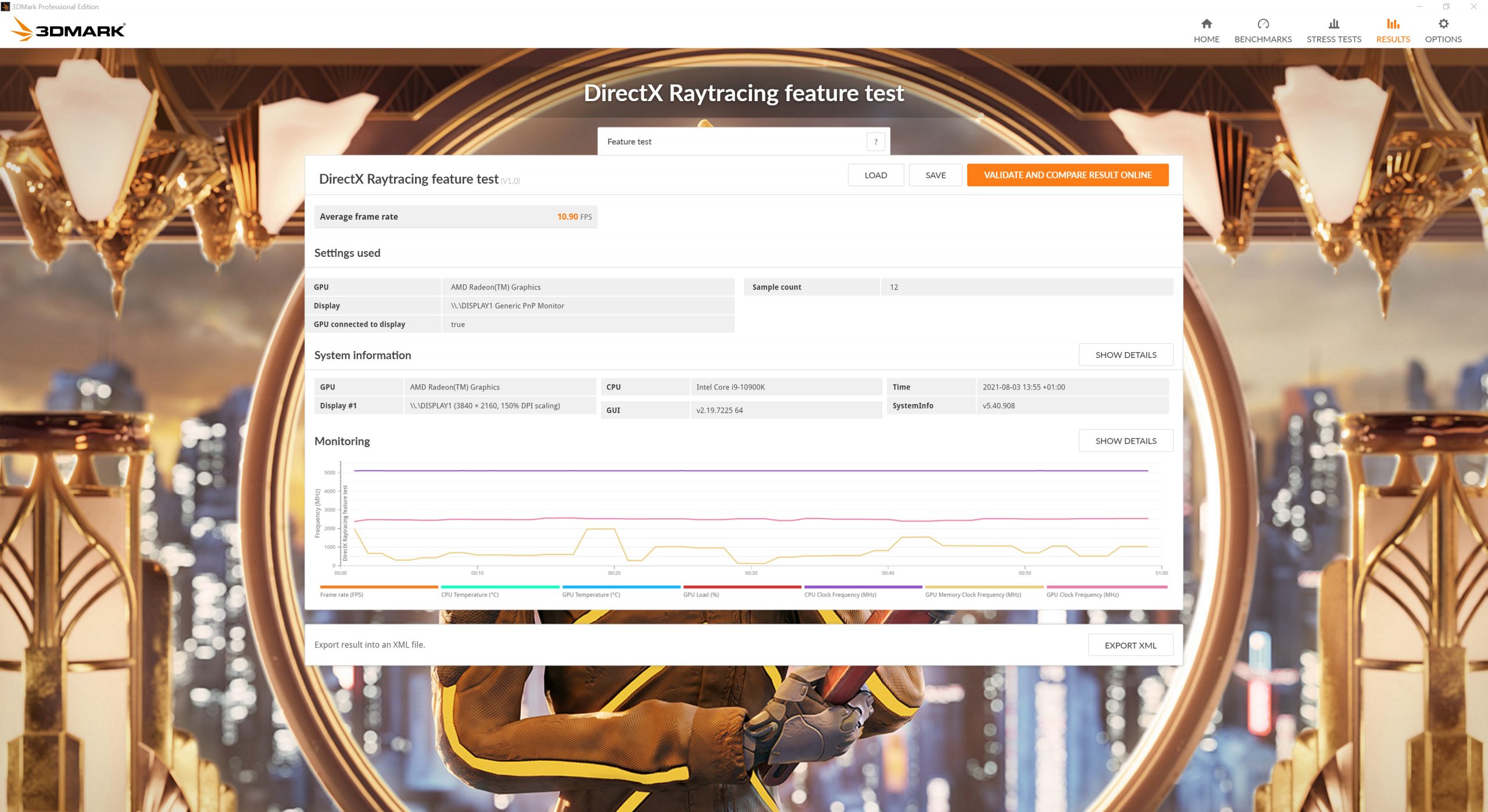 Real-time ray tracing is incredibly demanding. The latest graphics cards have dedicated hardware that’s optimized for ray-tracing. The 3DMark DirectX Raytracing feature test measures the performance of this dedicated hardware. Instead of using traditional rendering techniques, the whole scene is ray-traced and drawn in one pass. The result of the test depends entirely on ray-tracing performance. (UL).