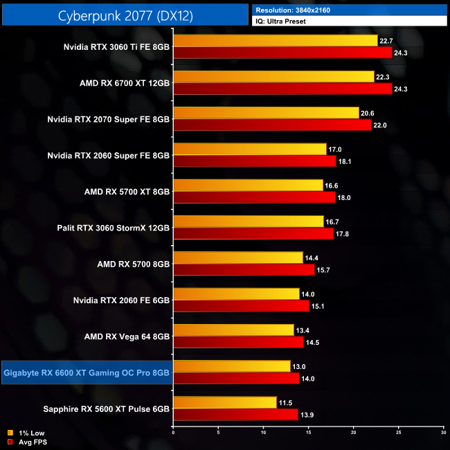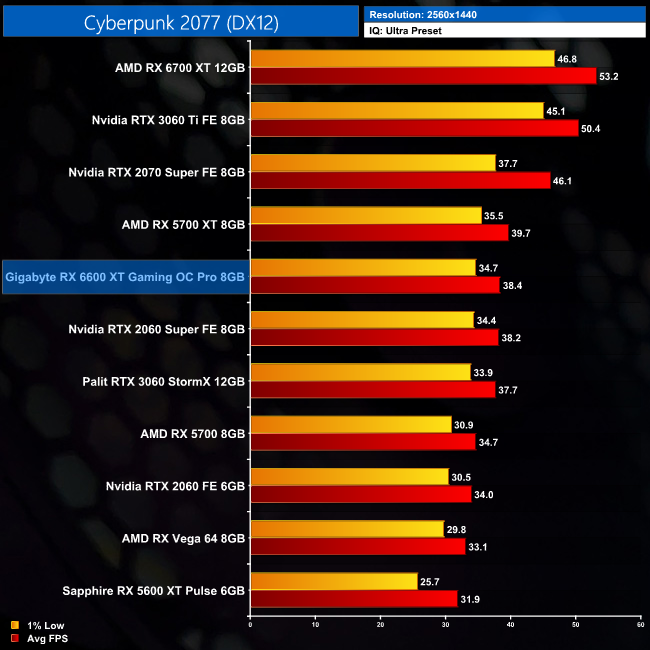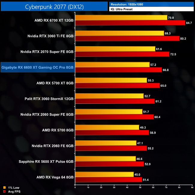 Next up is Cyberpunk 2077, where the RX 6600 XT manages 67FPS at 1080p. That's enough to give it a 9% lead over the RTX 3060, but it is well behind the RTX 3060 Ti, despite just a $20 difference in the cards' MSRPs. We're also looking at just a 2FPS uplift over the RX 5700 XT, a GPU which also launched for just 20USD more over two years ago.