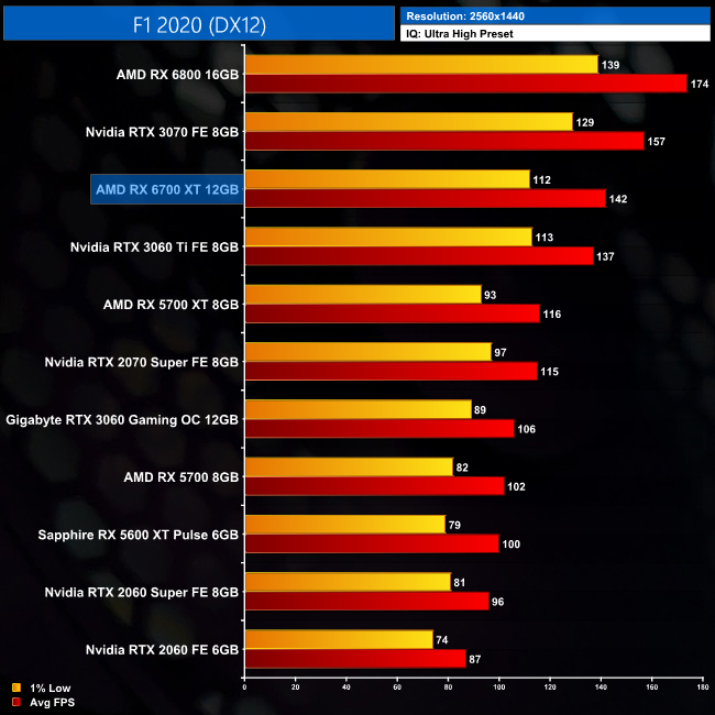 The 6700 XT does fall away at 1440p though, where it hits 142FPS on average, meaning it is now 10% slower than the RTX 3070. The 5FPS lead it has over the RTX 3060 Ti is a difference of just 4%.