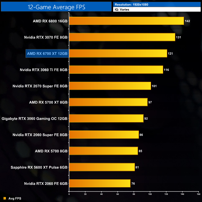 Looking at the big picture overview with our 12-game average FPS, we'll start with the 1080p data. Here we can see the RX 6700 XT is on average 8% slower than the RTX 3070, and 4% faster than the RTX 3060 Ti. It's also 15% slower than its big brother, the RX 6800, and compared to the RX 5700 XT, we're looking at a generational uplift of 25%.