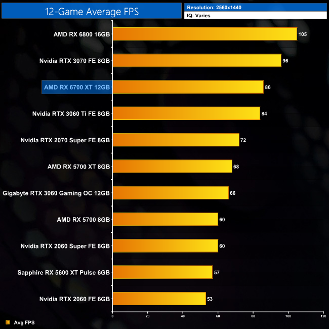 As for 1440p, here we can see the RX 6700 XT is 10% slower than the RTX 3070 and just 2% ahead of the RTX 3060 Ti. It's also 18% slower than the RX 6800, and against the RX 5700 XT it delivers an extra 26% performance.