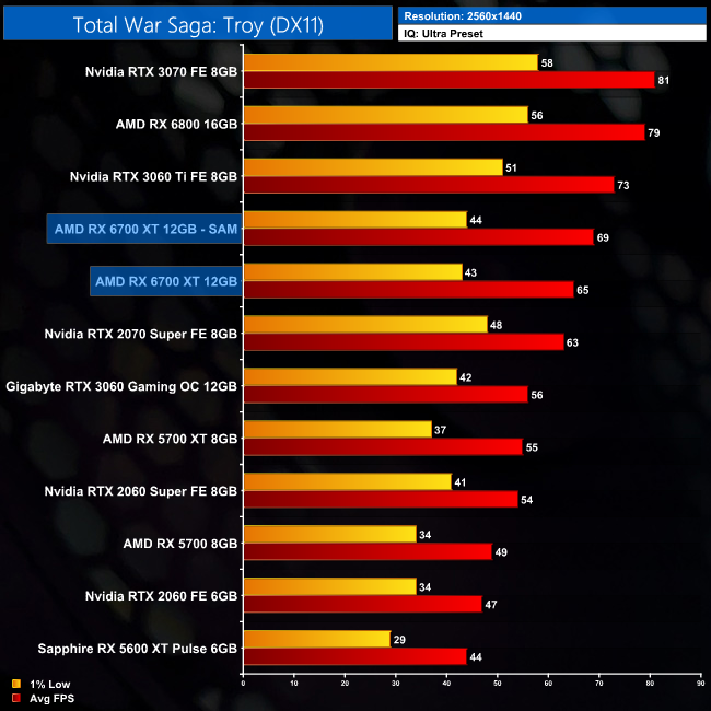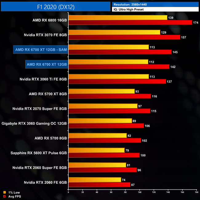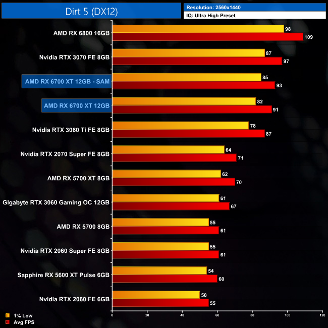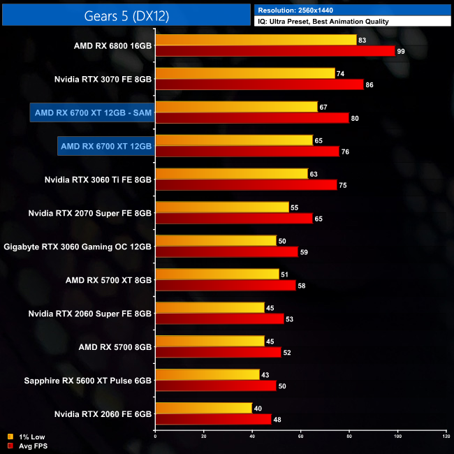 Re-testing the twelve games in our test suite at 1440p, we found performance of the RX 6700 XT increased by up to 6% with SAM enabled, and the only game where performance degraded was in Watch Dogs: Legion, and that was only a difference of a single frame. Gears 5, Red Dead Redemption 2 and Assassin's Creed Valhalla all saw 5% improvements, though three of our games did not see any benefit at all.