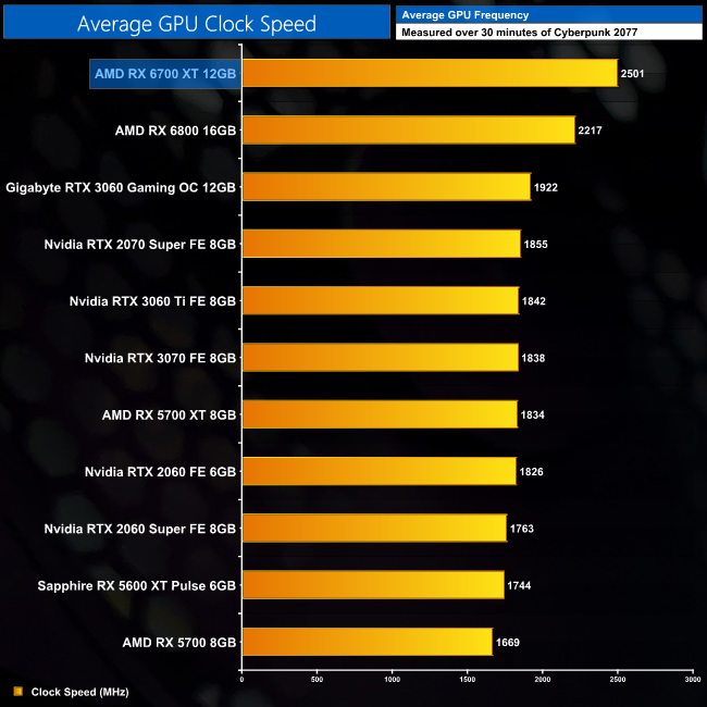 Here we present the average clock speed for each graphics card while running Cyberpunk 2077 for 30 minutes. We use GPU-Z to record the GPU core frequency during gameplay. We calculate the average core frequency during the 30 minute run to present here.