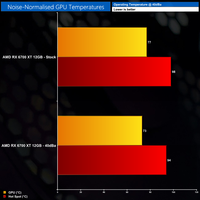 Following on from our stock thermal and acoustic testing, here we re-test the operating temperature of the GPU, but with noise levels normalised to 40dBa. This allows us to measure the efficiency of the overall cooling solution as varying noise levels as a result of more aggressive fan curves are no longer a factor.
