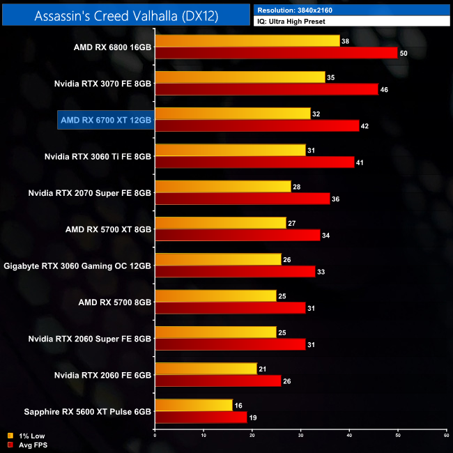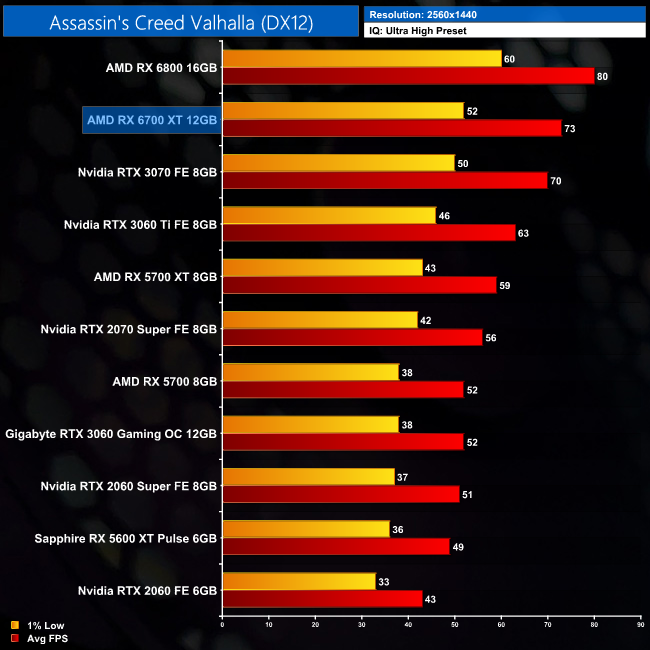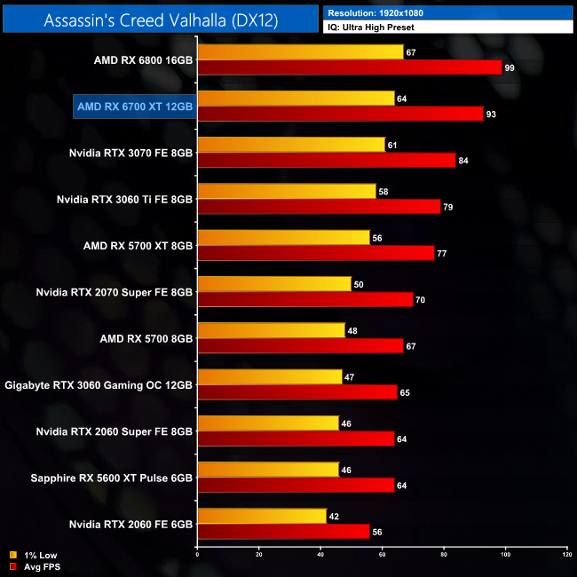 Getting things started with Assassin's Creed Valhalla, believe it or not this is actually the game where we saw the RX 6700 XT do its best versus the RTX 3070 and RTX 3060 Ti. At 1080p, for instance, its average of 93FPS is 11% ahead of the RTX 3070 and 18% faster than the RTX 3060 Ti.