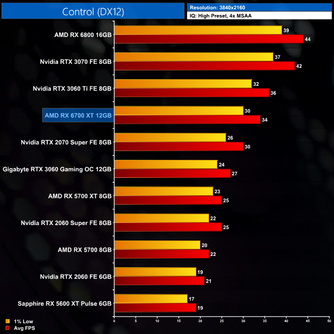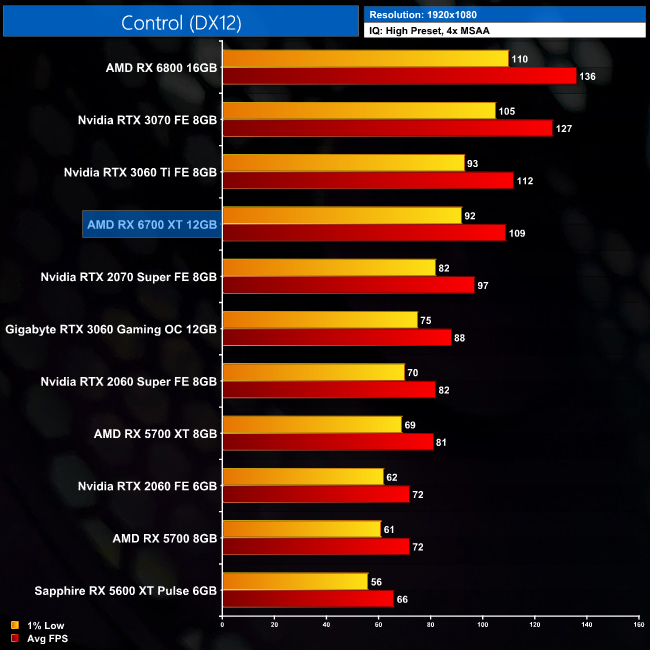 Control is the polar opposite of what we saw from AC Valhalla. At 1080p, the RX 6700 XT is 3FPS slower than the RTX 3060 Ti, averaging 109FPS. That makes it 16% slower than the RTX 3070, and 20% slower than its big brother, the RX 6800. Quite the turnaround!