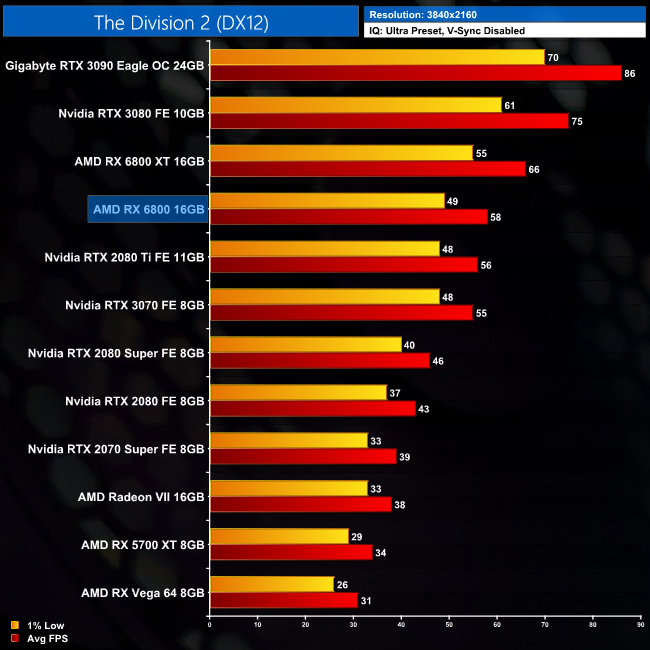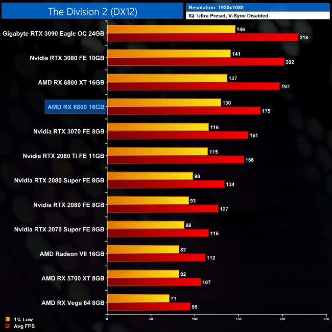 Nvidia's Ampere architecture does well in The Division 2, and we can see that as the RX 6800 is just 6% faster than the RTX 3070 at 1440p. Compared to the RTX 2080 Ti, it's an 8% lead for the AMD GPU.