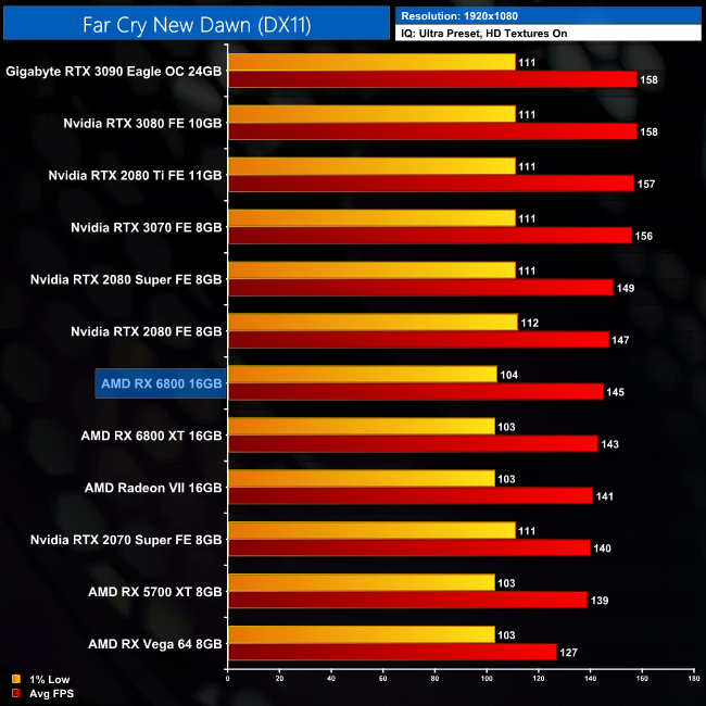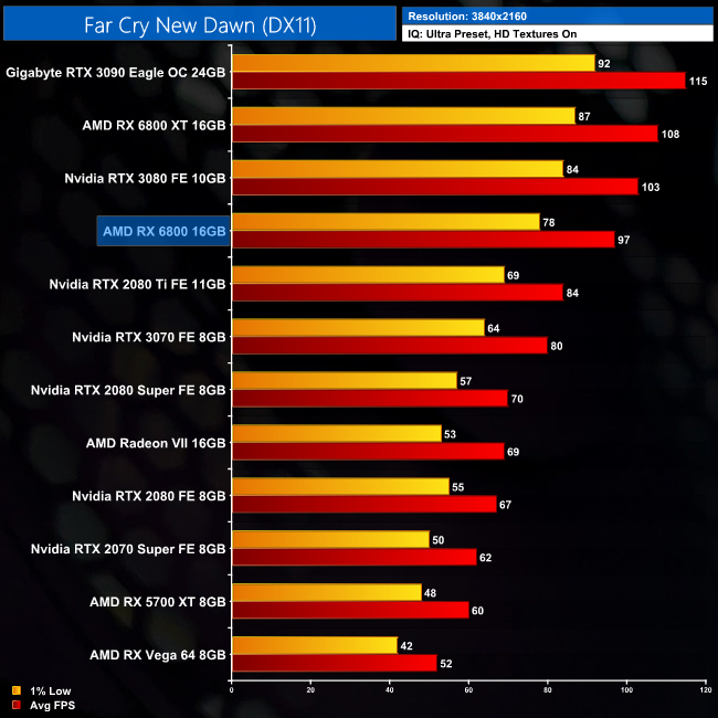 Far Cry New Dawn's results aren't really that relevant until we hit 4K – even at 1440p, there is clear evidence of a system bottleneck going on. Focusing on 4K then, this is another very strong title for the RX 6800 as it is just 6% slower than the RTX 3080, while it holds a very convincing 21% lead over the RTX 3070.