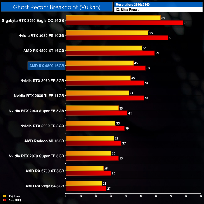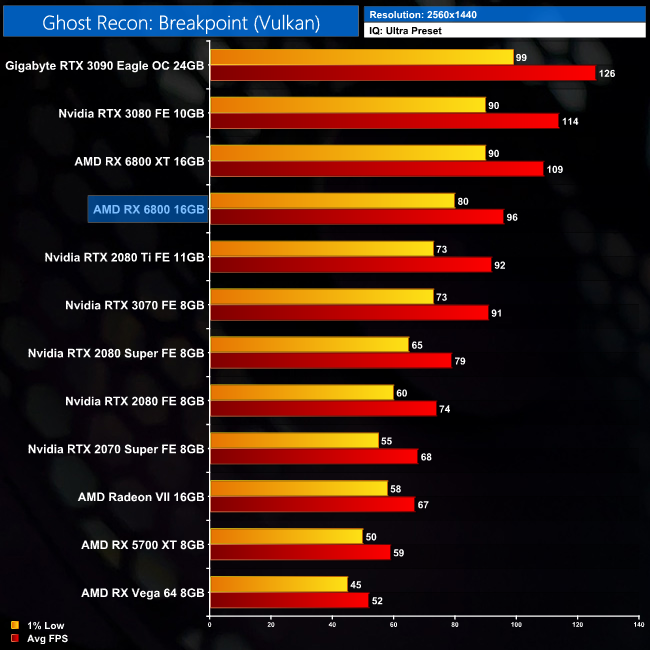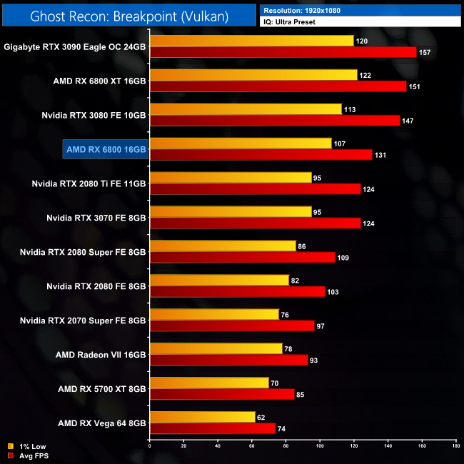 Despite being (another) AMD title, there really is not a lot between the RX 6800 and the RTX 3070 in Ghost Recon: Breakpoint. At 1440p for instance, AMD's GPU is just 5% faster, and the gap is even smaller when compared to the RTX 2080 Ti.