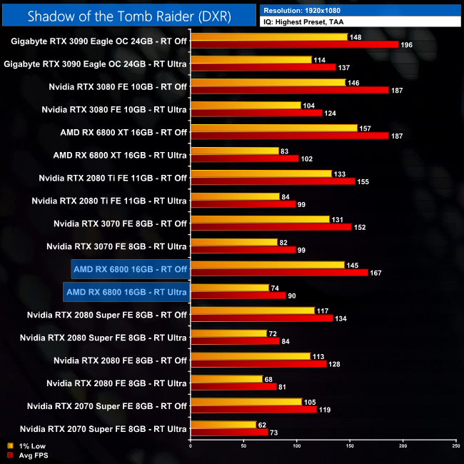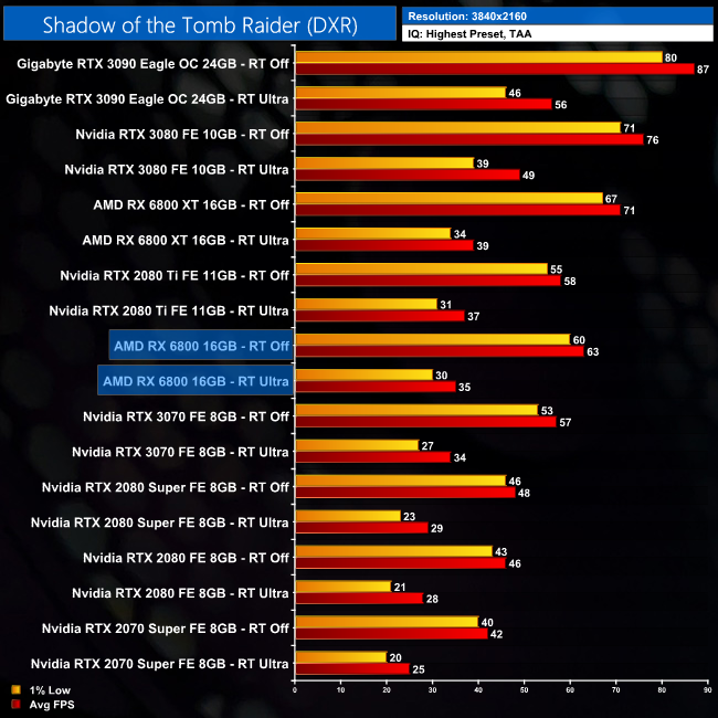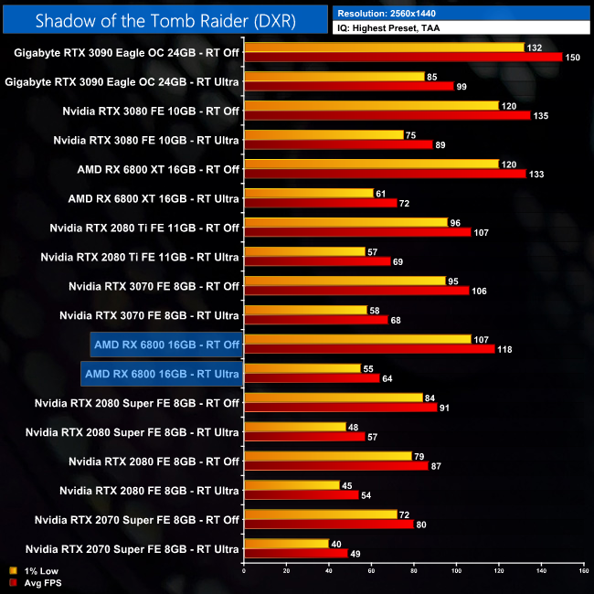 Shadow of the Tomb Raider utilises ray traced shadows and is overall less demanding on the GPU than Control. That means frame rates for the RX 6800 are much higher once ray tracing is enabled, with the GPU delivering over 60FPS at 1440p. At that same resolution, the RTX 3070 is 6% faster with ray tracing at Ultra settings, which is a pretty good result for the RX 6800 all things considered.