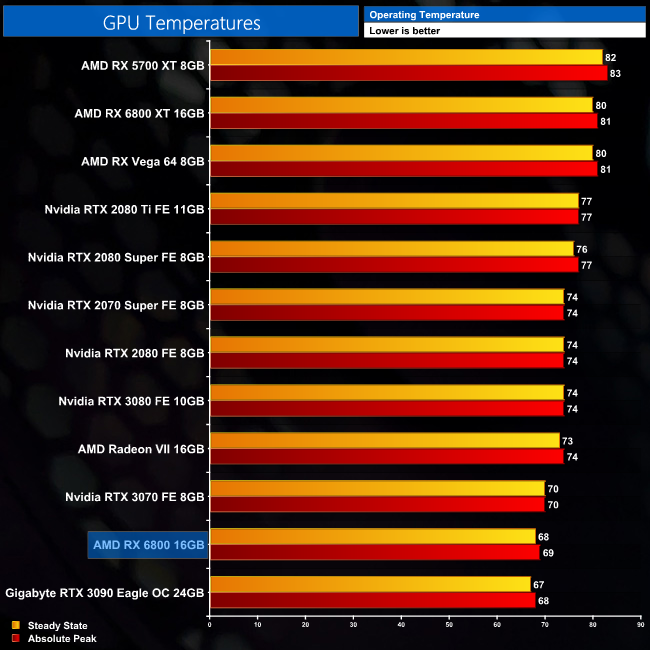 Thermally, the RX 6800 reference card performs very well. We saw a typical operating temperature of just 68C, while it occasionally spiked up to 69C. There's really nothing to complain about – it's a very capable reference cooler.