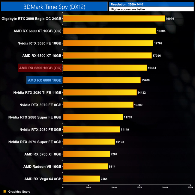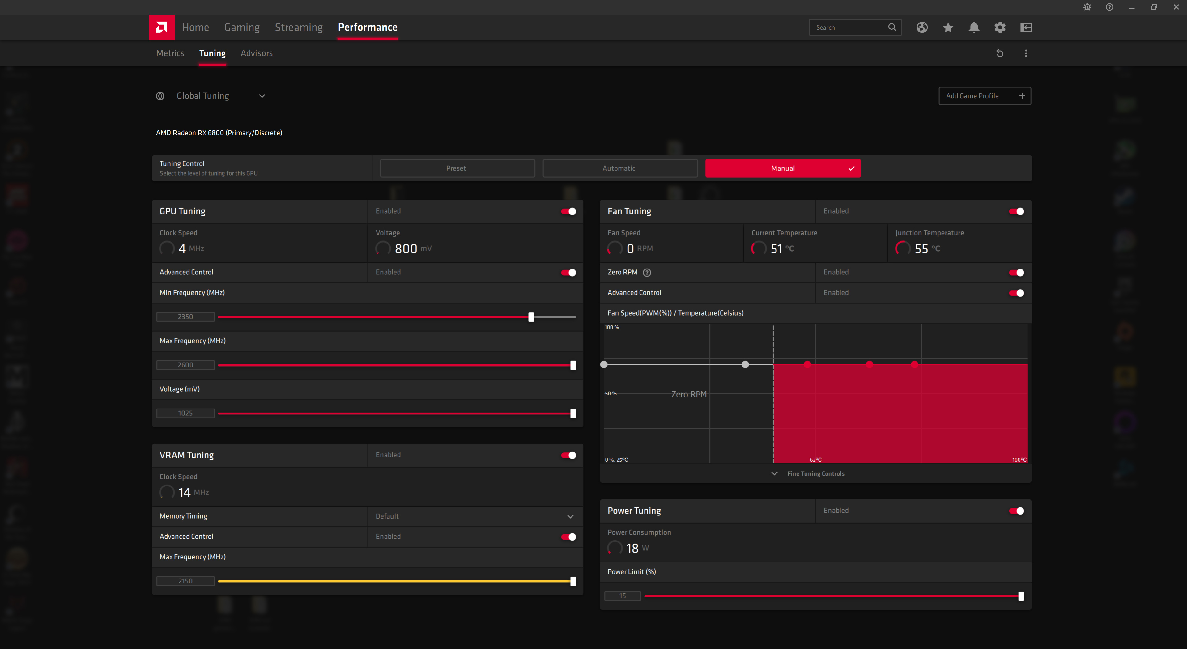 Overclocking capabilities for the RX 6800 are impressive. Using AMD Wattman, we comfortable maxed out the GPU frequency slider (to 2600MHz), while also hitting the memory slider limit of 2150MHz, all while increased the power limit to 115%.