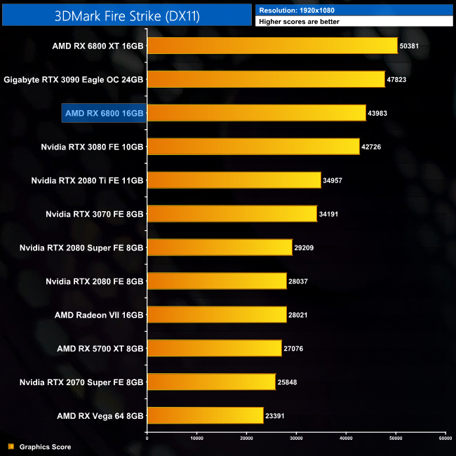 Starting proceedings with 3DMark. AMD's Navi GPUs have historically done well in these benchmarks, and the RX 6800 out-scores even the RTX 3080 in Fire Strike, delivering almost 44,000 points.