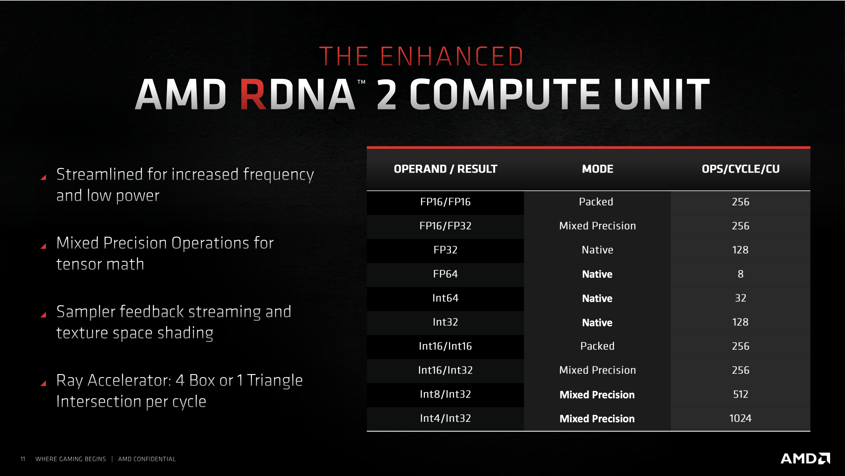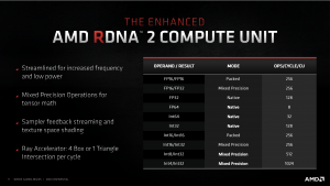 Part of this is a result of the huge changes that AMD claims the RDNA 2 CU has undergone to achieve that touted 30% higher performance at the same power compared to RDNA. The company highlights the difference machine learning can make for gaming, resulting in various mixed precision operations included within the design to accelerate these AI workloads.
