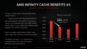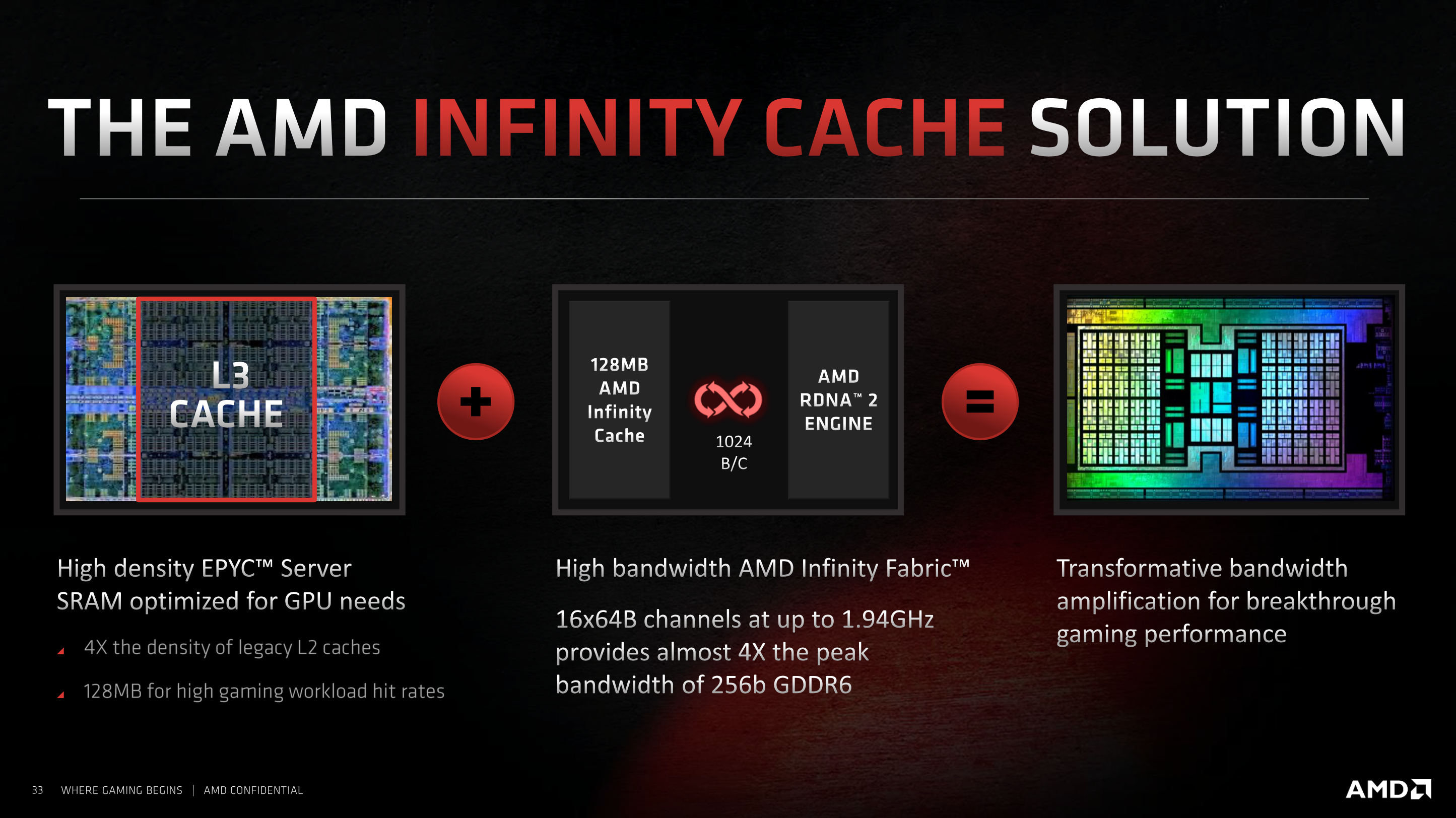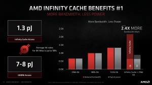 AMD's Infinity Cache has also garnered significant attention. AMD implemented this solution to deliver enough bandwidth to the increased CU count, running at higher frequencies, as it claims these two changes would have otherwise required a 2.6x increased to bandwidth without starving the GPU – something it claims would have been hugely impractical due to the physical size and power requirements.