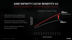 Additionally, the Infinity Cache enables AMD to better scale its performance with the increased GPU frequency. Without the Infinity Cache, the relative gains from increasing core clocks diminish significantly at the higher frequencies.