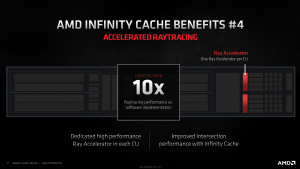 Each CU is also now home to one Ray Accelerator, the hardware responsible for handling the intersection of rays with the Bounding Volume Hierarchy (BVH). AMD says the Ray Accelerator can calculate up to 4 ray/box intersections or ray/triangle intersection every clock, and overall offers roughly 10 times the ray tracing performance than what shaders alone could achieve.