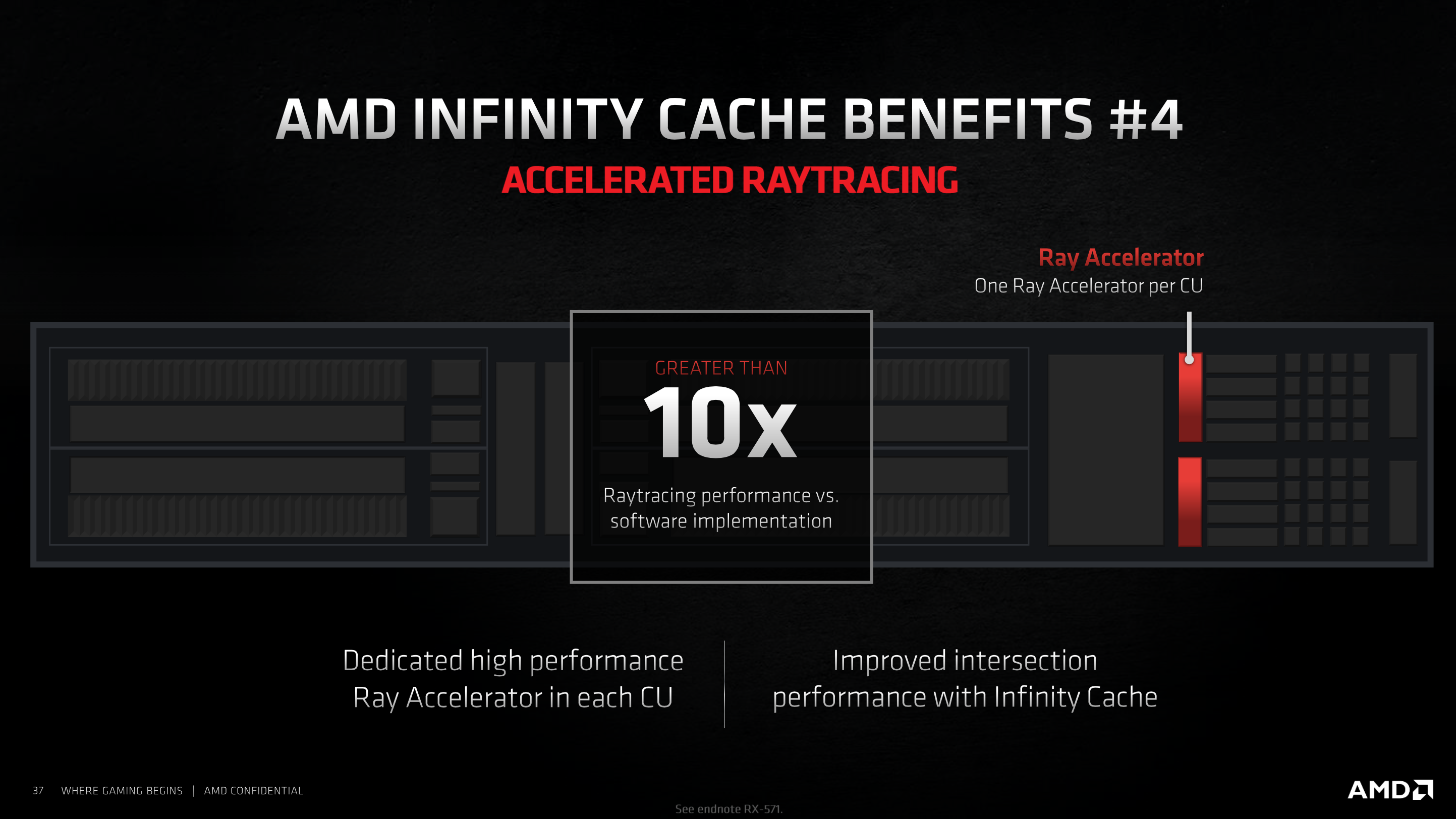 The final performance characteristics will depend on the game, the type of raytracing effects used and optimizations. However, we believe our Ray Accelerators along with other RDNA 2 enhancements such as frequency increase, CU count increase and Infinity Cache will help deliver visually stunning gameplay both with and without raytracing at native resolutions.”