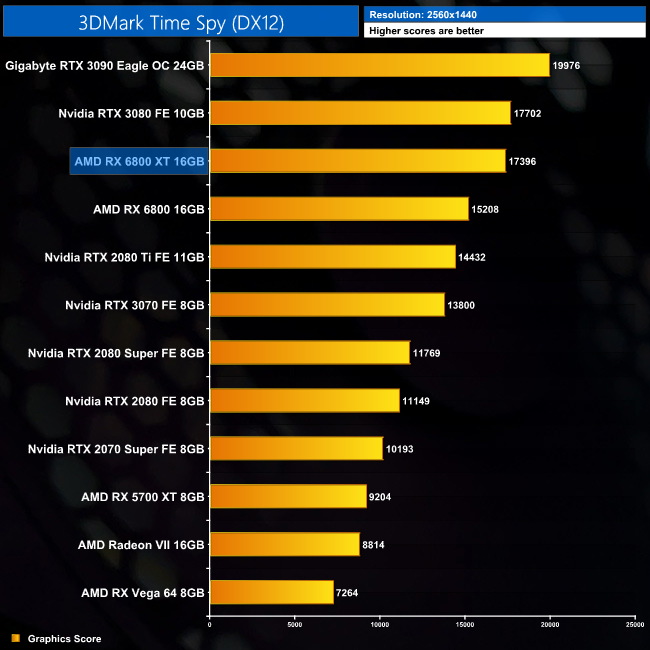 Time Spy is not as favourable, but here the RX 6800 XT achieves parity with the RTX 3080 which is still a good result. Of course, these are ‘only' synthetic benchmarks, but they are interesting nonetheless – and I'll be fascinated to see what Fire Strike scores the likes of Der8auer can achieve once LN2 is applied to the 6800 XT…