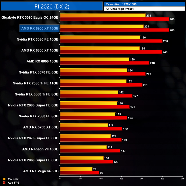 Next we come to F1 2020, and it's no surprise to see the 6900 XT pushing over 200FPS in this title when looking at the 1440p data. That puts it pretty neatly in between the RTX 3080 and 3090, as it is 5% faster than the 3080 but 4% behind the 3090.