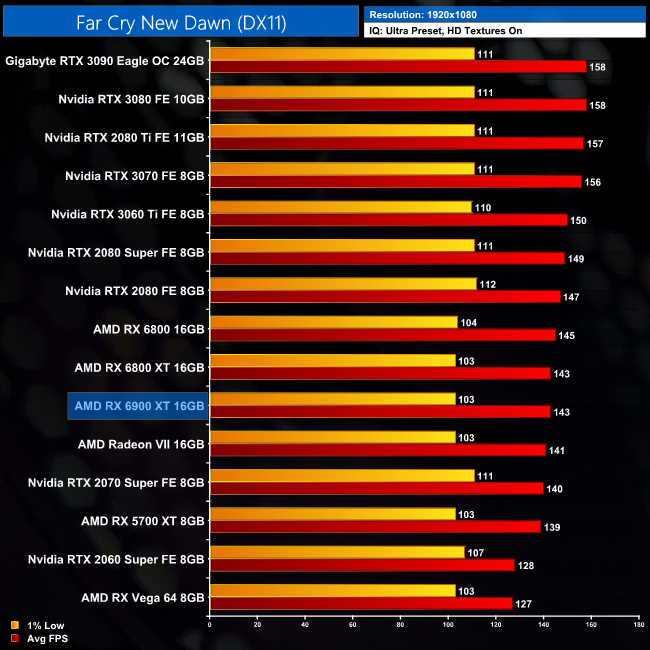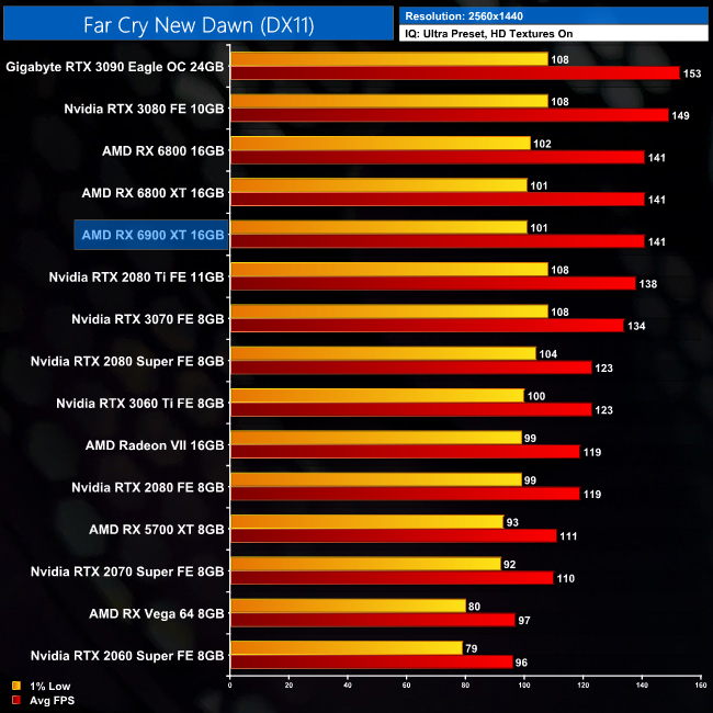 Looking at Far Cry New Dawn, even at 1440p there is a clear system bottleneck going on, as all three of AMD's RDNA 2-based GPUs are delivering identical performance.