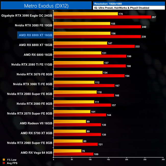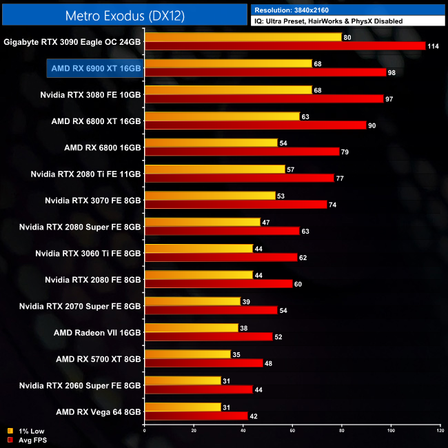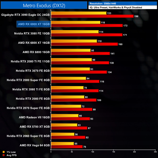 Looking at the 1440p data from Metro Exodus, we can see the 6900 XT is neck and neck with the RTX 3080, which means it is 8% faster than the 6800 XT, but still 13% slower than the RTX 3090.