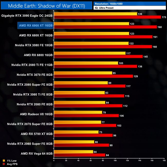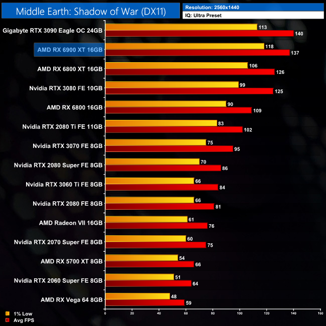 As for Middle Earth: Shadow of War, things look promising for the 6900 XT at 1440p, where it is 10% faster than the RTX 3080, and only 2% behind the RTX 3090.