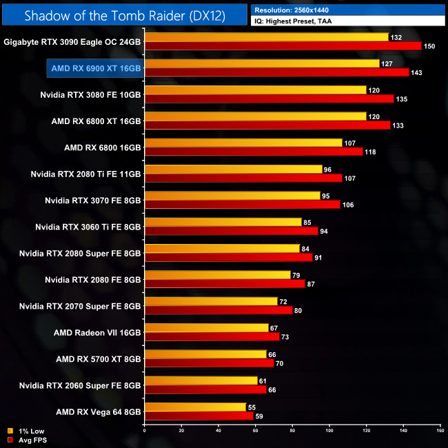 Looking at Shadow of the Tomb Raider, the overall trend here is pretty similar to Red Dead Redemption 2. At 1440p, the 6900 XT is 6% faster than the RTX 3080, but 5% slower than the RTX 3090.