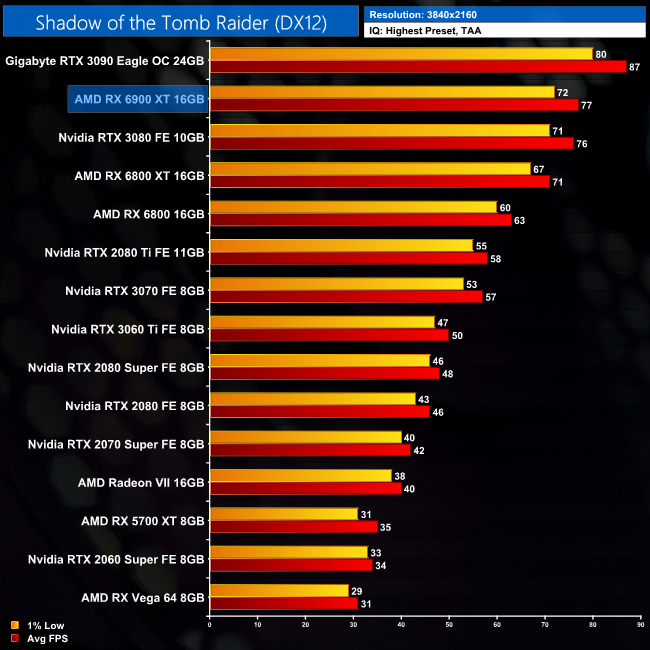 And then again at 4K, Ampere comes on strong, and we can see the RTX 3080 and 6900 XT are now effectively matched, delivering 76-77FPS on average. The 6900 XT is also 11% slower than the RTX 3090.