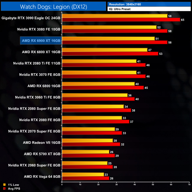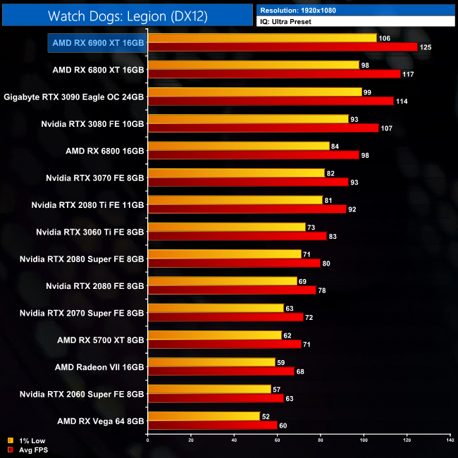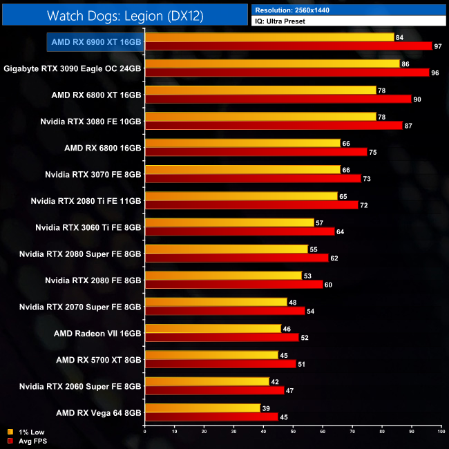 Our final game is Watch Dogs: Legion, and at 1440p the 6900 XT delivers an excellent result, hitting 97FPS on average. This puts it 11% ahead of the RTX 3080, while it is on par with the RTX 3090.