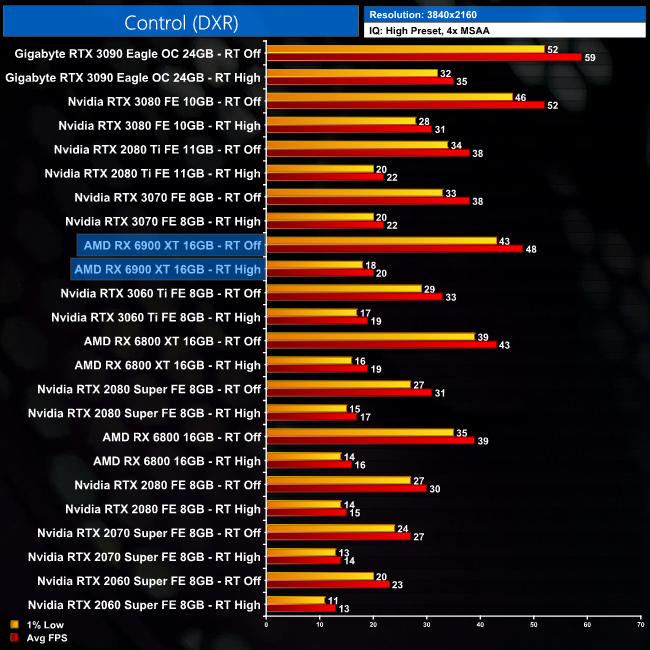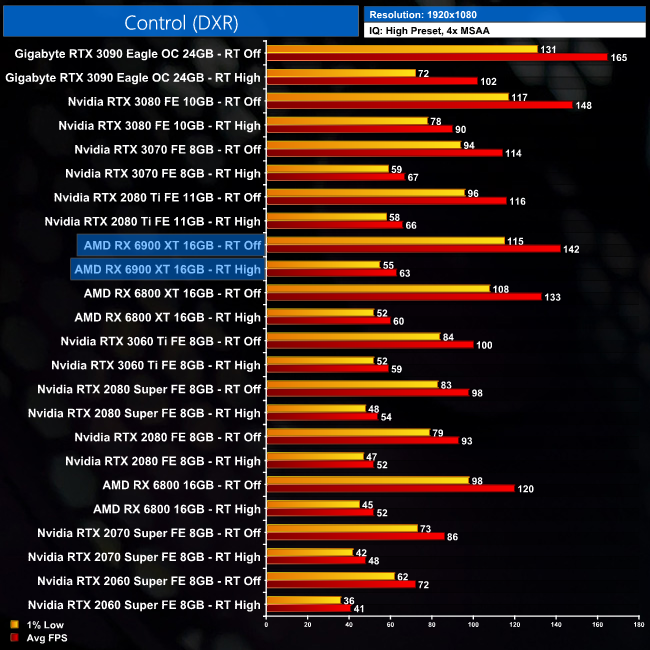 In terms of the 6900 XT's ray tracing performance, we start with Control. At 1080p, the 6900 XT delivers 63FPS with ray tracing set to its highest value, which means it's barely 7% faster than Nvidia's £369 RTX 3060 Ti. RTX 3080, meanwhile, is in another league entirely, as the 6900 XT is 30% slower.