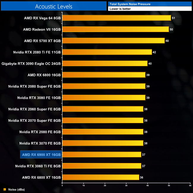 Of course, the fact that the 6900 XT runs its fans 200rpm or-so faster than the RX 6800 XT, means it is a tiny bit louder, with a reading of 37dBa on our sound meter. To my ear, the noise wasn't noticeably louder than the 6800 XT though, and it's still a terrific result overall.