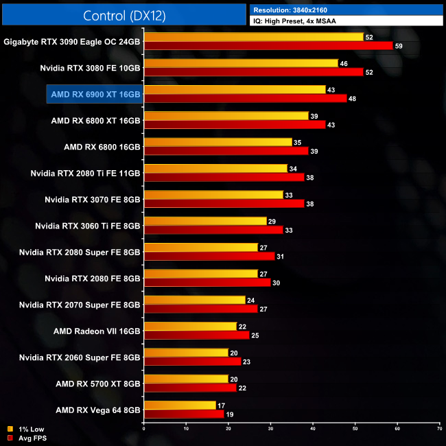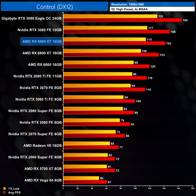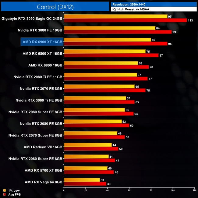 Our next game is Control, an Nvidia title and accordingly we see stronger performance from Team Green. At 1440p, the 6900 XT delivers 95FPS on average, putting it 9% ahead of the 6800 XT, but still 4% slower than the RTX 3080 and 16% slower than the RTX 3090.