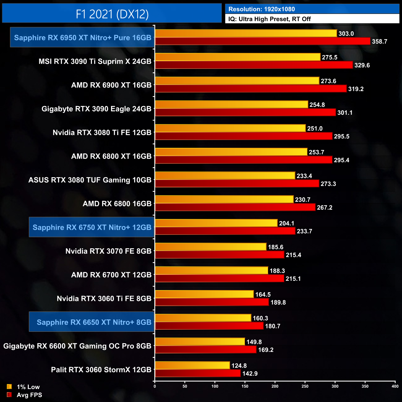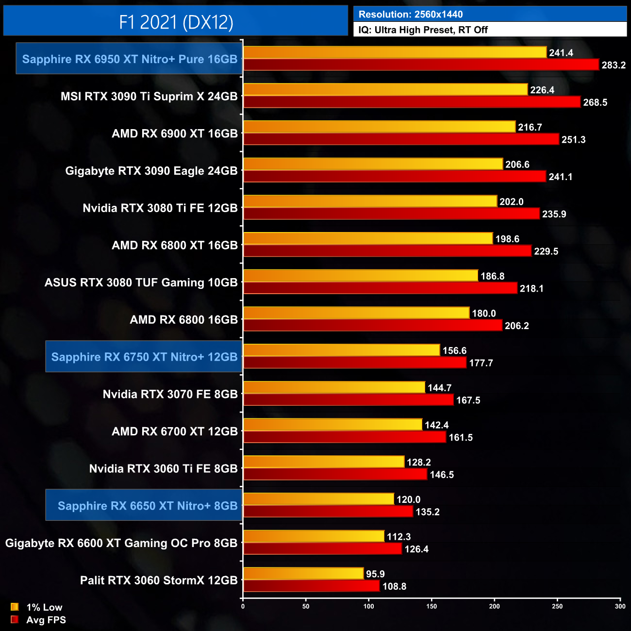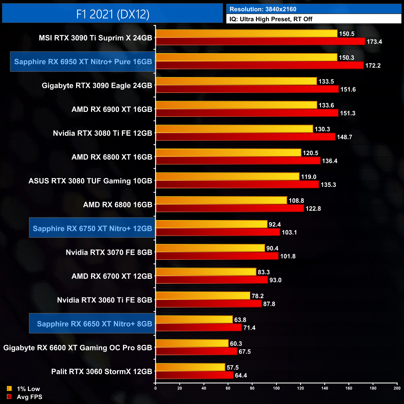 F1 2021 is pretty representative of overall performance from these new cards. The RX 6650 XT delivers an extra 6-7% performance over the RX 6600 XT, whereas the 6750 XT is a decent 9-11% faster than the vanilla model. The Nitro+ RX 6950 XT continues to impress, with 12-14% gains over the RX 6900 XT shown here.