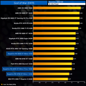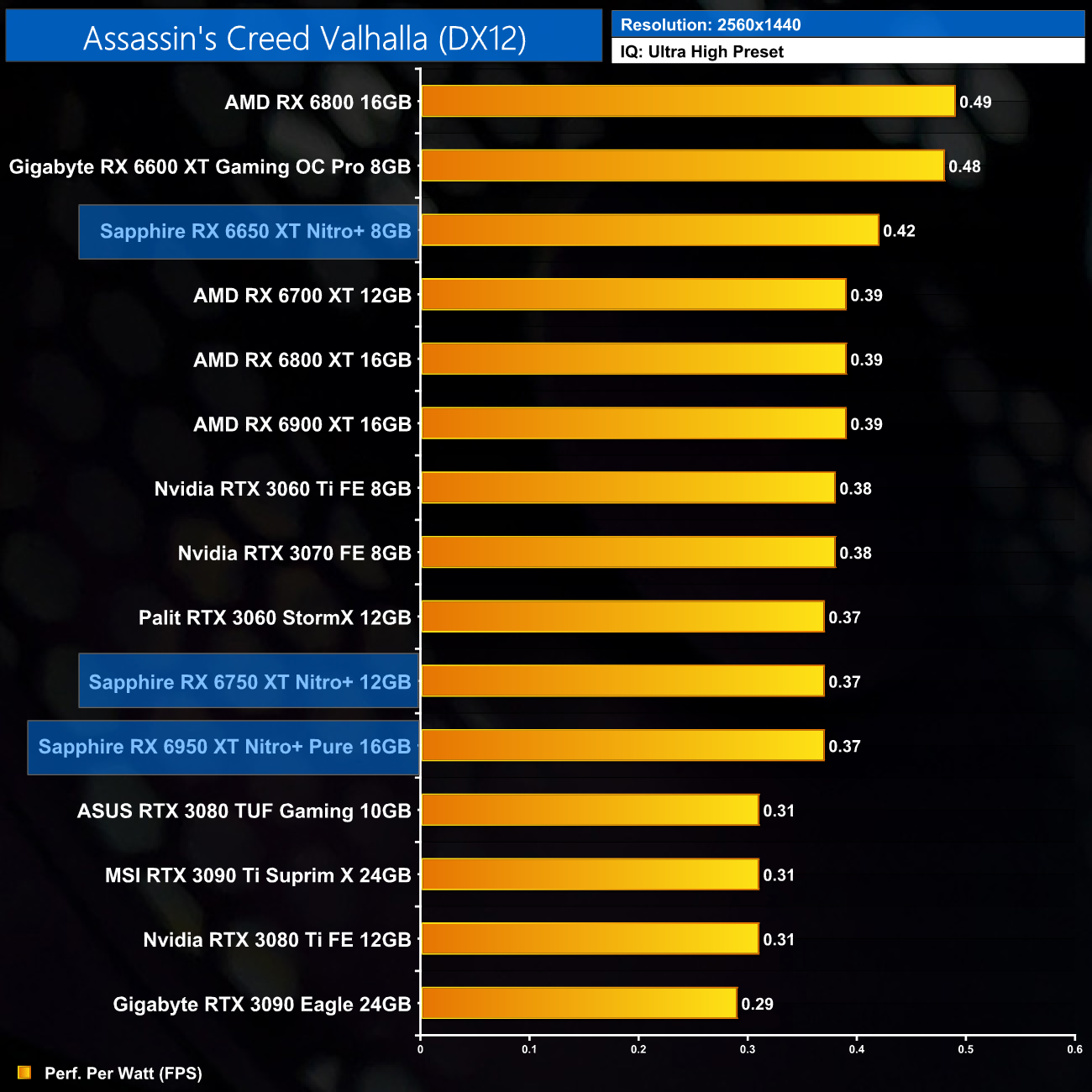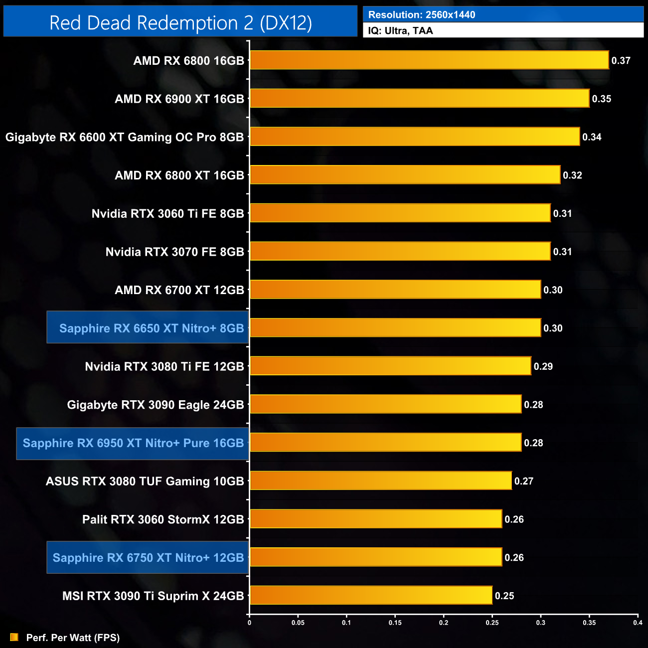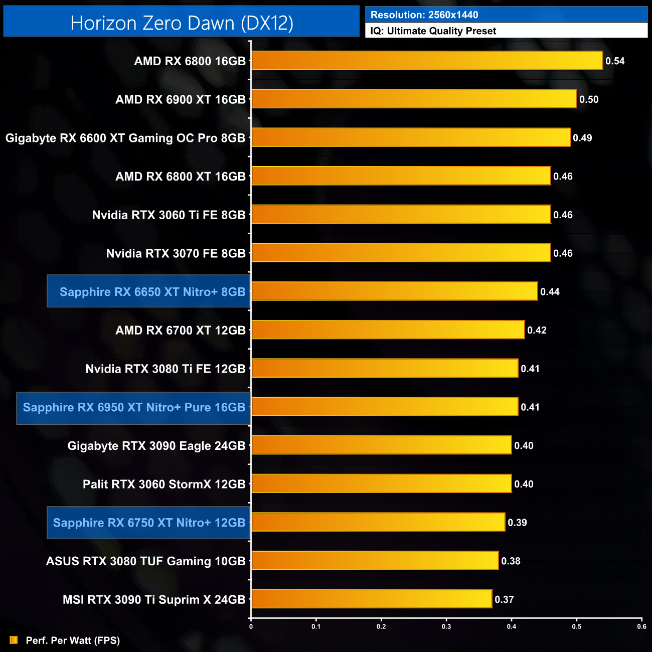 The same goes at 1440p. The original RX 6900 XT is one of the most efficient GPUs on the market – Sapphire's RX 6950 XT Nitro+ is about 17% less efficient in terms of performance per Watt.