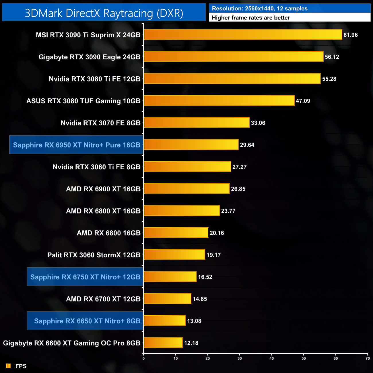 Ray tracing isn't a huge boost for the RX 6X50 series either, as it doesn't have any extra RT cores or streaming processors to aid with BVH traversal. Instead, the only increase in ray tracing performance comes due to the increased clock speed, and performance scales similarly to 3DMark Time Spy.