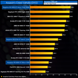 Power figures get even higher at 1440p, with the RX 6950 XT now approaching 400W, not at all far off a 100W increase compared to the 6900 XT. The RX 6750 XT is pulling 266W, and that's still over 40W more than the RX 6700 XT, while the 6650 XT draws just over 170W.
