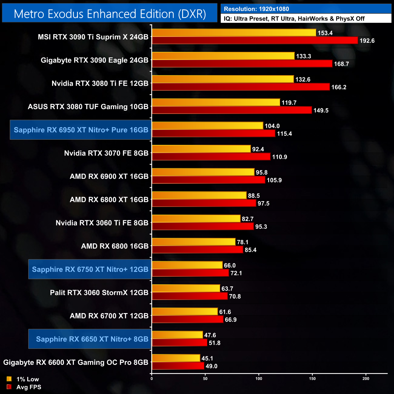 Just to re-iterate as well, these numbers don't take into account the fact that we tested three heavily factory overclocked models from the the Sapphire Nitro+ series, while our comparison cards were all tested at reference clocks. That means, if we were testing reference models against reference models, I would expect smaller margins than what is shown here – the Nitro+ Pure RX 6950 XT has an 11% factory overclock for instance, which would definitely boost performance by a decent chunk compared to a reference card.