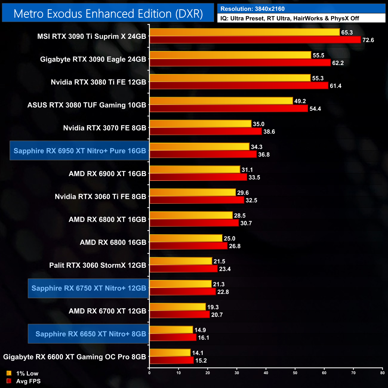 The RX 6X50 cards manage much more playable frame rates in Metro Exodus Enhanced Edition, with the 6950 XT averaging over 100FPS at 1080p, but Nvidia still has the upper hand here. At 1440p, the 6950 XT is neck and neck with the RTX 3070.