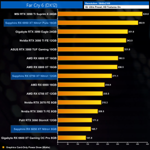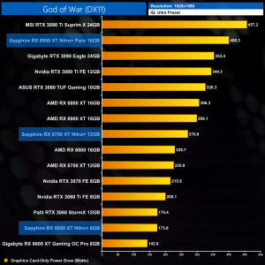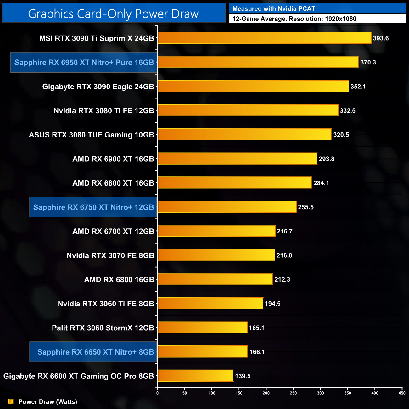 The increase in clock and memory speed necessitates an increase to power draw. Sapphire raised power targets even further than the reference figures however, but we can still see some significant jumps at 1080p – the 6950 XT draws over 70W more than the 6900 XT, while the 6750 XT is pulling another 40W over the RX 6700 XT.